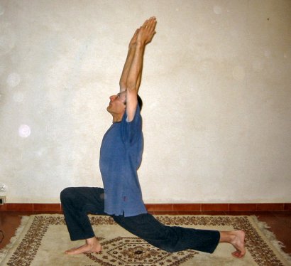 Enfin sur l'expiration immédiate qui suit, il faut pivoter sur les pieds pour retrouver la position d'origine. Garder quelques instants la position et faire aller le souffle dans la colonne, puis abandonner, faire quelques pas, bien récupérer et recommencer en inversant le côté de la jambe fléchie. Inverser et recommencer l'enchaînement symétrique.