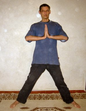 Il faut démarrer debout les pieds très écartés, les mains jointes dans le geste Anjali Mudrâ :