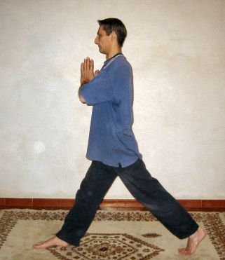Expirer sans bouger puis sur une inspiration, il convient de pivoter sur un côté de 90° en glissant sur les pieds. Il est à remarquer la position du pied arrière qui doit se tenir en appui uniquement sur les orteils. De plus les pieds doivent être sur le même alignement procurant un effet d'équilibre à l'ensemble de la posture :