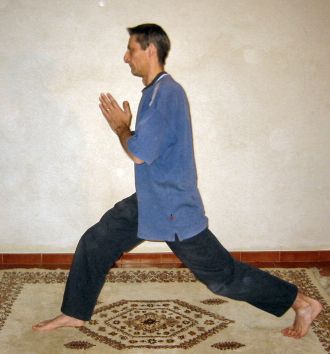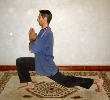 Enfin sur l'expiration immédiate qui suit, il faut pivoter sur les pieds pour retrouver la position d'origine. Garder quelques instants la position et faire aller le souffle dans la colonne, puis abandonner, faire quelques pas, bien récupérer et recommencer en inversant le côté de la jambe fléchie. Inverser et recommencer l'enchaînement symétrique.
